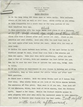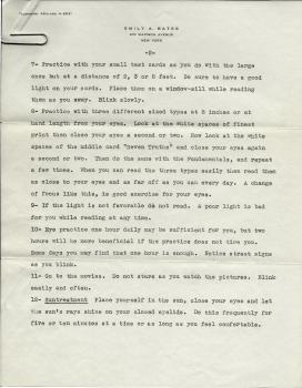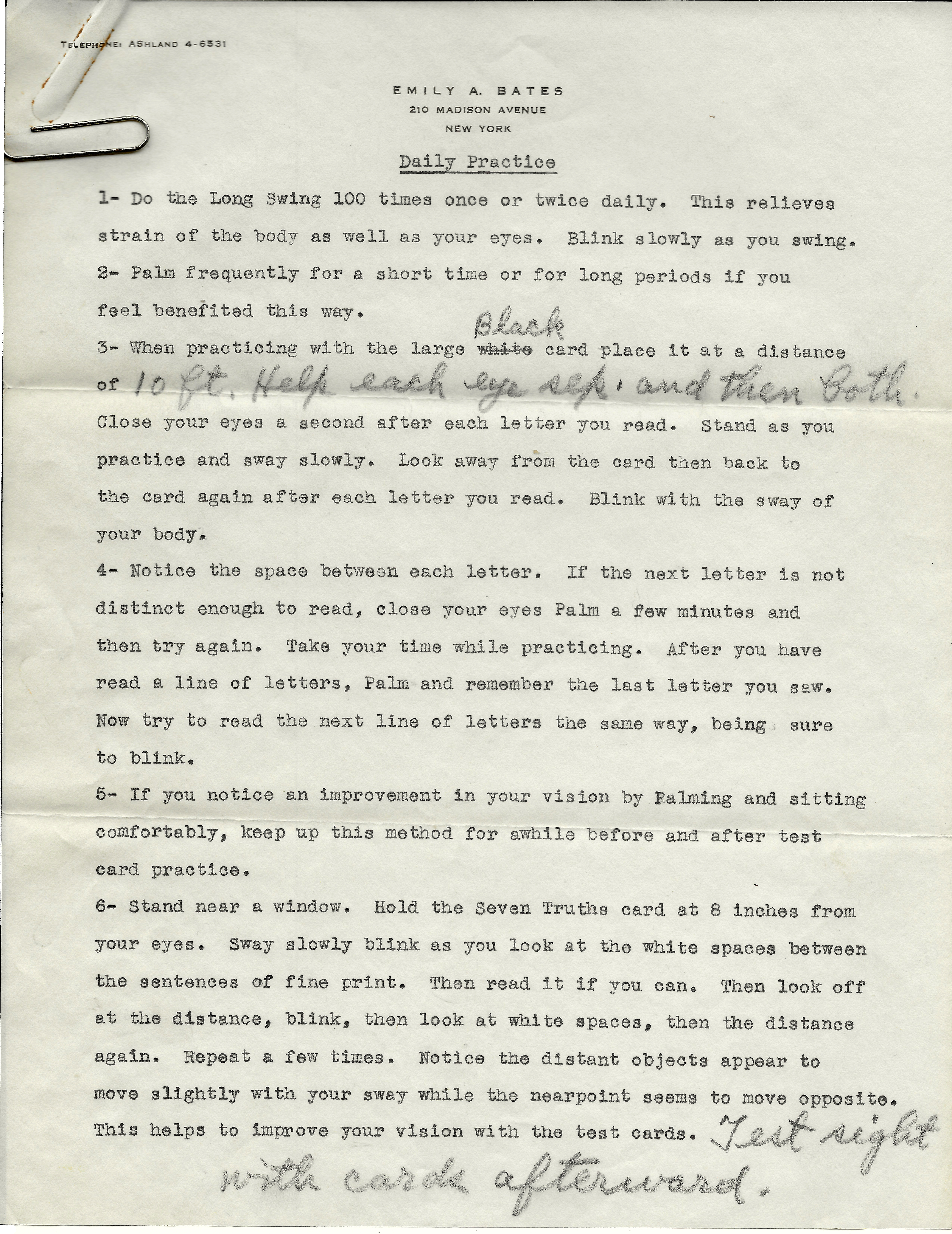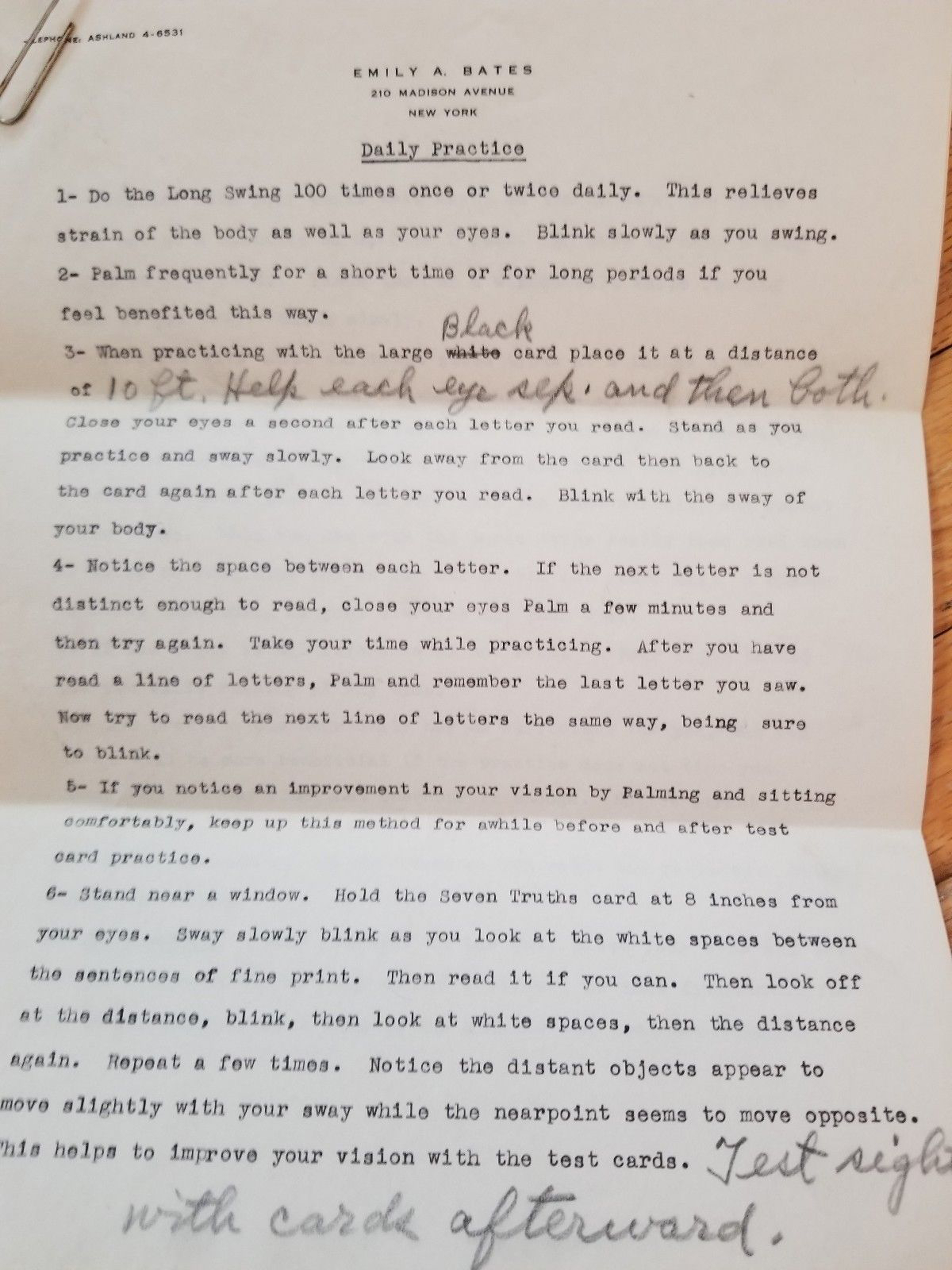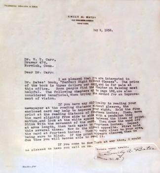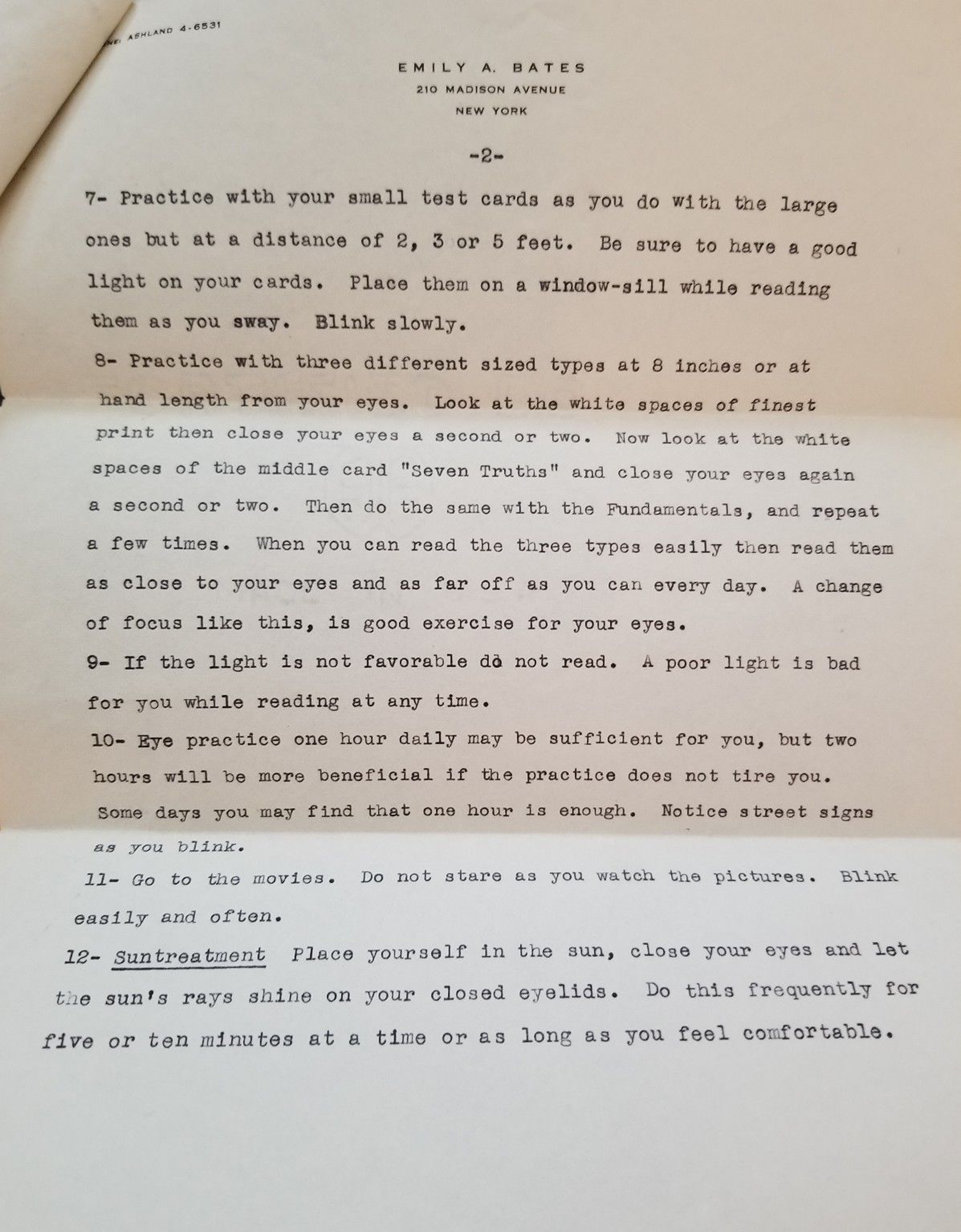 Here's a letter 'possibly' by Emily Bates. Could be forged. But; it does sound like her way of speaking/teaching. A guy on ebay been making false antiques and training pamphlets, eyecharts stating is by Dr. Bates. But this one might be real, seems to be by a different seller. Was on ebay in a old copy of Dr. Bates book 'Perfect Sight Without Glasses' selling for $245.00. And it was not labeled correct. If it was the forger; he would have labeled the book title correct to make the sale.